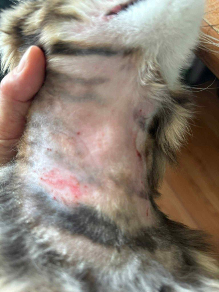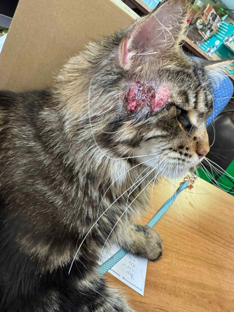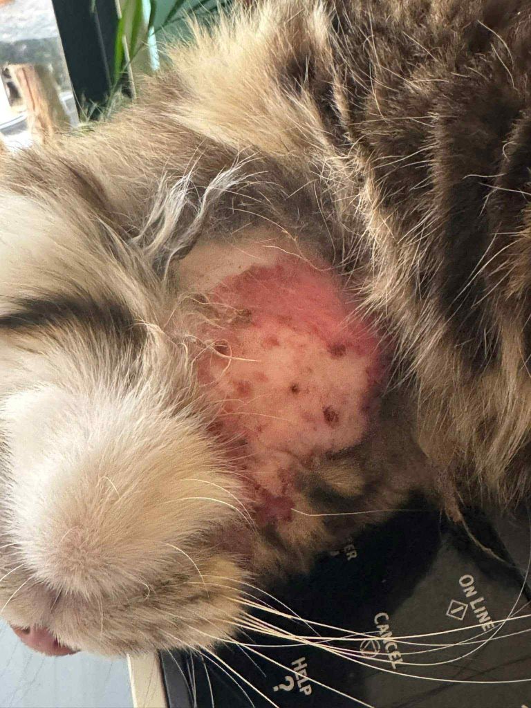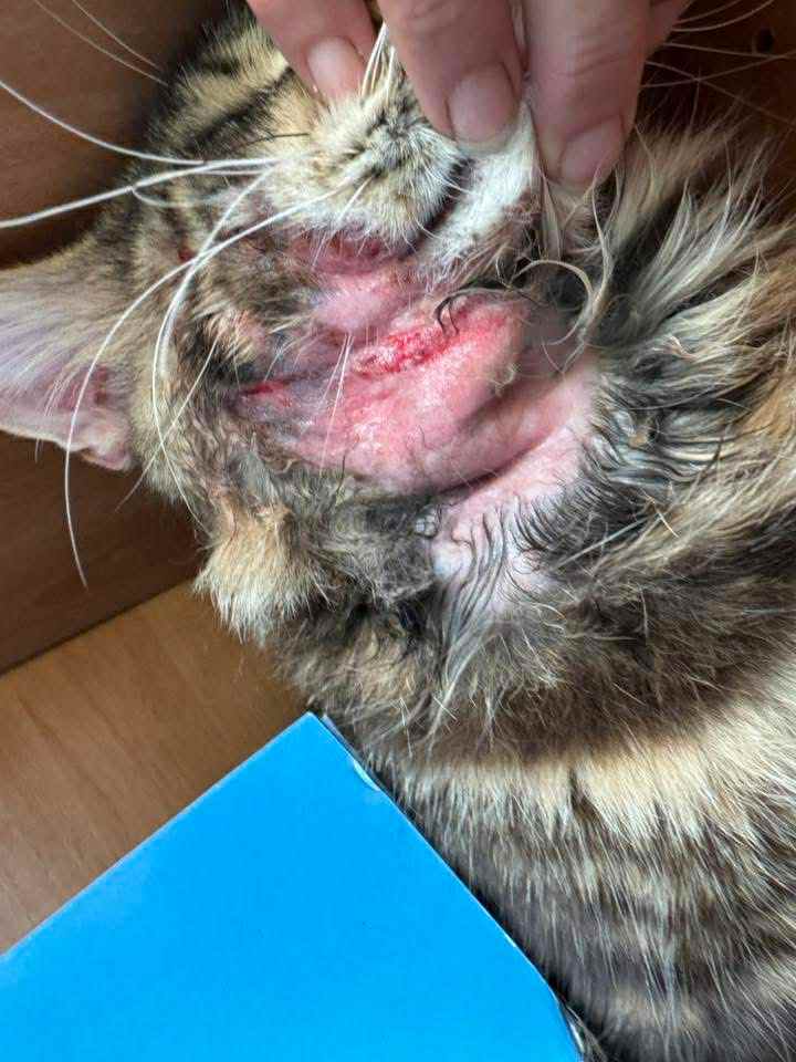 Een paar weken na de show kwam het krabben echter terug en was het zelfs nog heviger. De dierenarts en ik wisten al dat het een allergie was. Er verschenen typische hotspots aan de zijkanten van de kop. De toestand verergerde snel ā de kat had bijna de helft van zijn kop en nek zonder haar, de huid was open en de ontsteking was op zijn hoogtepunt. Hij raakte bijna in shock en moest vanwege hoge koorts in het ziekenhuis worden opgenomen.