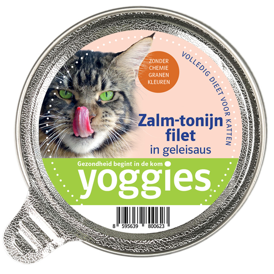 Yoggies kattencups met sappige stukjes tonijn en zalm en vooral heerlijke gelei-saus. De populaire Yoggies cups zijn ongetwijfeld een traktatie voor alle katten. Het vlees is afkomstig van de jacht in de open Noordse zeeën en de geleisaus wordt gemaakt van een bouillon van dit vlees, botten en kwaliteitsgroenten. Deze bakjes en hun inhoud kunnen als complete voeding voor katten dienen, omdat ze essentiële voedingsstoffen bevatten, waaronder: het aminozuur Taurine.