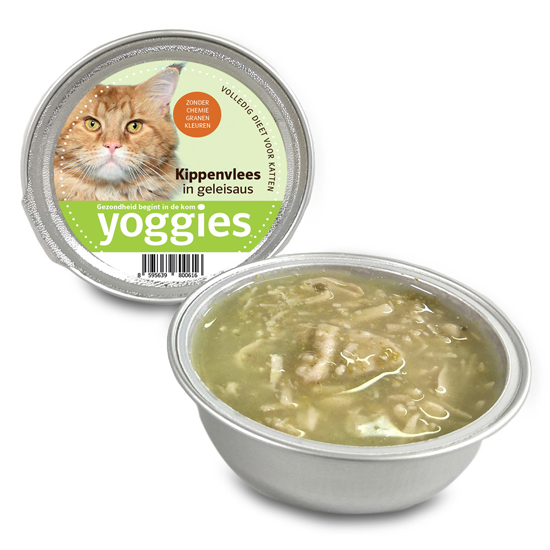 pakket met Yoggies kattencups met sappige kip en vooral heerlijke gelei-saus.