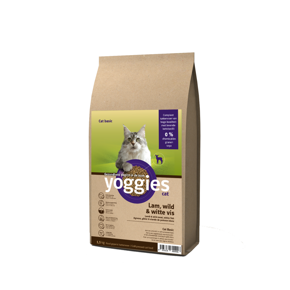 Yoggies Cat “Basic” koudgeperste korrels, voornamelijk ontworpen voor katten die vlees eten. Maar Yoggies Cat “Basic” kan ook gebruikt worden als bijvoer ter aanvulling van een kat die alleen vlees krijgt, of als bijgerecht bij vers vlees.