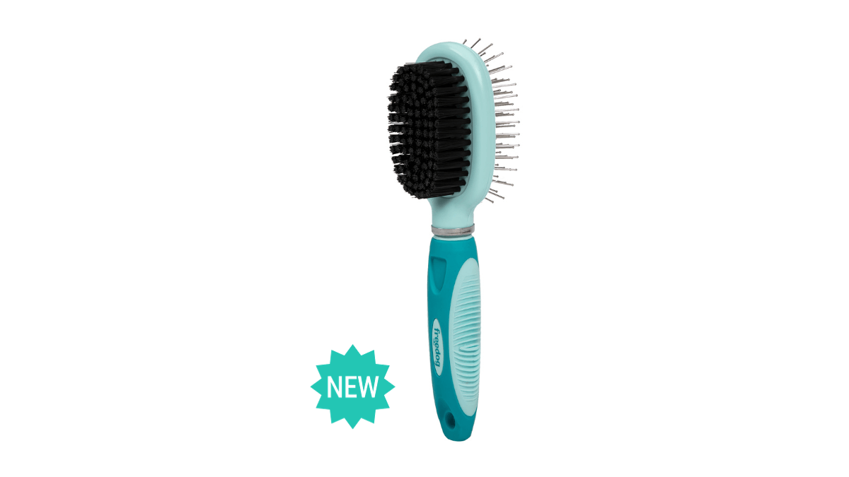 Met deze dubbelzijdige borstel beschikt u over de veelzijdigheid die u nodig heeft om verschillende delen van de vacht van uw huisdier te verzorgen. De ene kant heeft zachtere, fijnere borstelharen voor zacht borstelen, terwijl de andere kant stevigere borstelharen heeft om dood haar en klitten effectief te verwijderen.