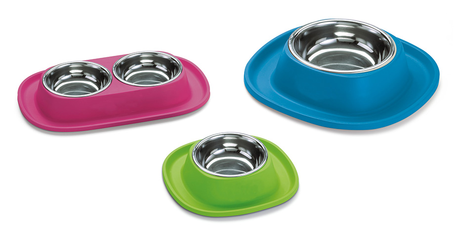 Drinkbakje van siliconen en roestvrij staal. Licht en gemakkelijk te wassen.