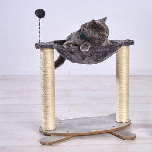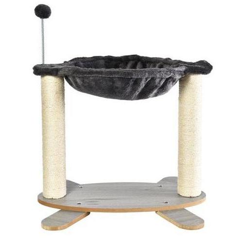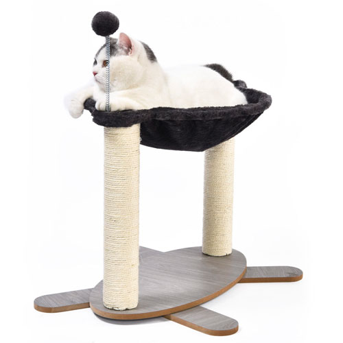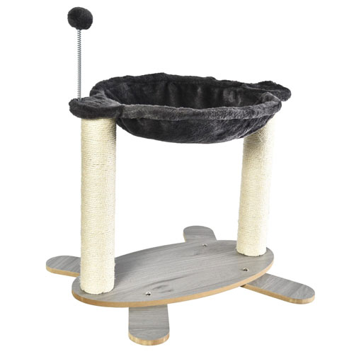 Dubbele post kattenkrabpaal met verend speeltje. Het verhoogde pluchen bed biedt een gezellige ruimte voor uw kat om te ontspannen. Premium duurzame productie.