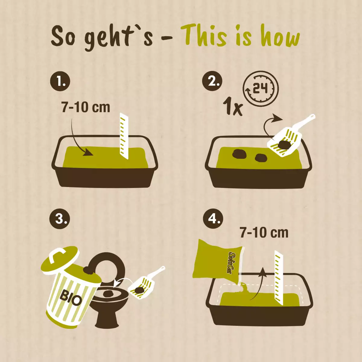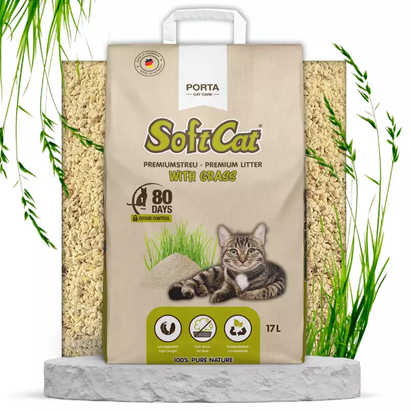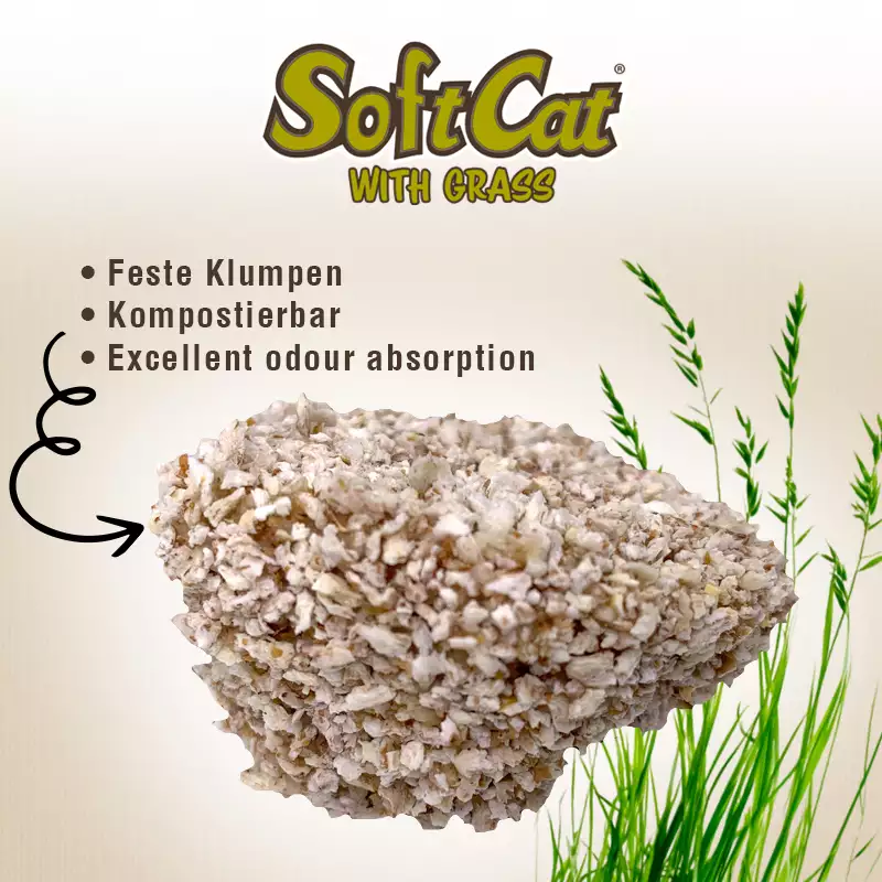 Iedereen kent het probleem: klonten natuurlijke kattenbakvulling op plantenbasis vallen snel uit elkaar en de losse onderdelen ervan vervuilen het toilet. Niet met SoftCat! Dankzij de perfecte combinatie van hernieuwbaar gras is Soft Cat uitgevonden: een natuurlijke, milieuvriendelijke kattenbakvulling met speciale klonterende eigenschappen, ultralicht en extreem absorberend. De plantenvezels van het strooisel hebben een bijzonder hoog absorptievermogen van 400% van het totale gewicht en vormen in zeer korte tijd stabiele en stevige klonten. Hierdoor worden onaangename geuren effectief gebonden. De klonten kunnen gemakkelijk worden weggegooid in de composthoop, in de GFT-bak of, afhankelijk van de regelgeving, door het toilet worden gespoeld.