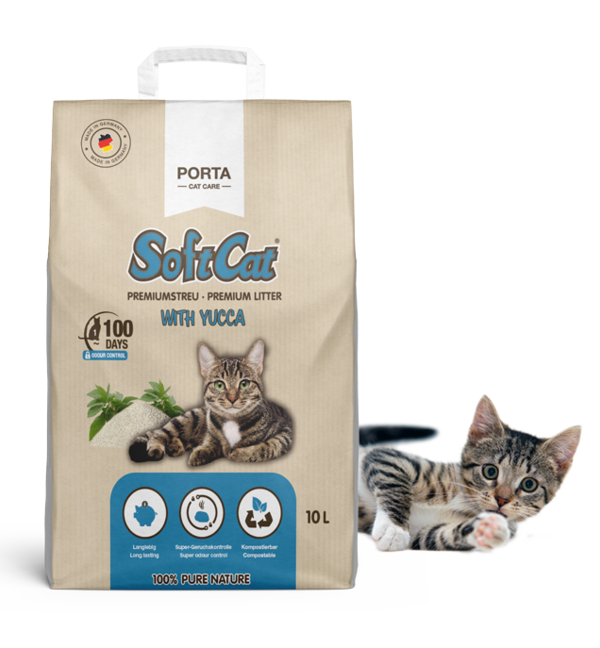 De snelgroeiende, natuurlijke grondstoffen in SoftCat Yucca maken dit kattenbakvulling bijzonder ecologisch waardevol en zorgen ervoor dat het zacht is voor gevoelige kattenpootjes en veilig voor het milieu. De uitstekende klontering en het goede geurbehoud van SoftCat Yucca garanderen een gemakkelijke filtering uit het gebruikte strooisel. Dit betekent dat een complexe volledige reiniging van het kattentoilet veel minder vaak nodig is. Gebruikt strooisel kunt u gebruiken als compost in de tuin of kunt u eenvoudig bij het GFT-afval en zelfs het toilet*** weggooien.