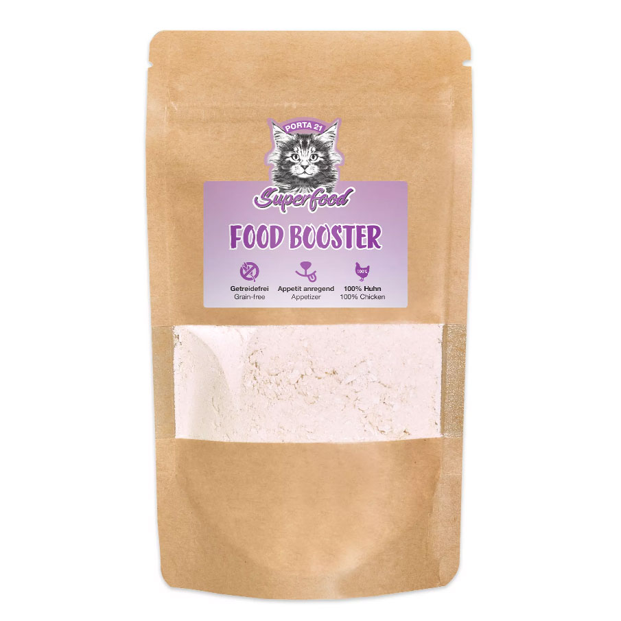 De Superfood Food Booster is een fijn poeder gemaakt van 100% puur, gedroogd kippenvlees en bevat geen smaakversterkers, bewaarmiddelen of additieven. Deze natuurlijke samenstelling volgt de natuurlijke voeding van katten en honden en voorziet uw huisdier bovendien van waardevolle dierlijke eiwitten die de ontwikkeling en regeneratie van spieren en botten ondersteunen.