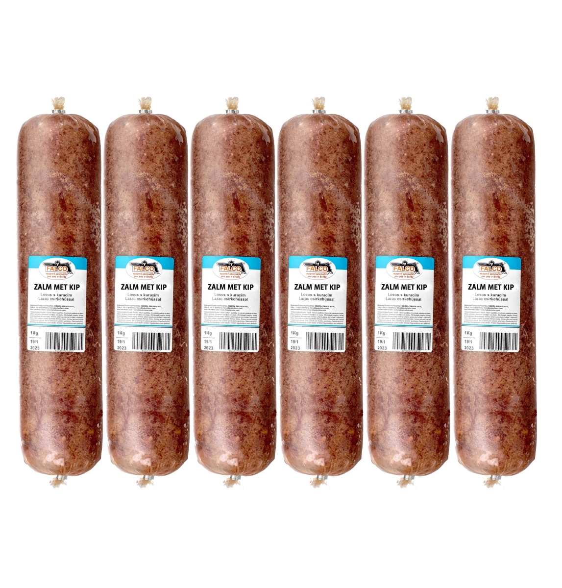 Een gehaktmengsel van zalm en kip. Alles verpakt in een verpakking van ongeveer 1 kg. De salami is verpakt in een kookdarm, zodat het mogelijk is om met de darm te koken.